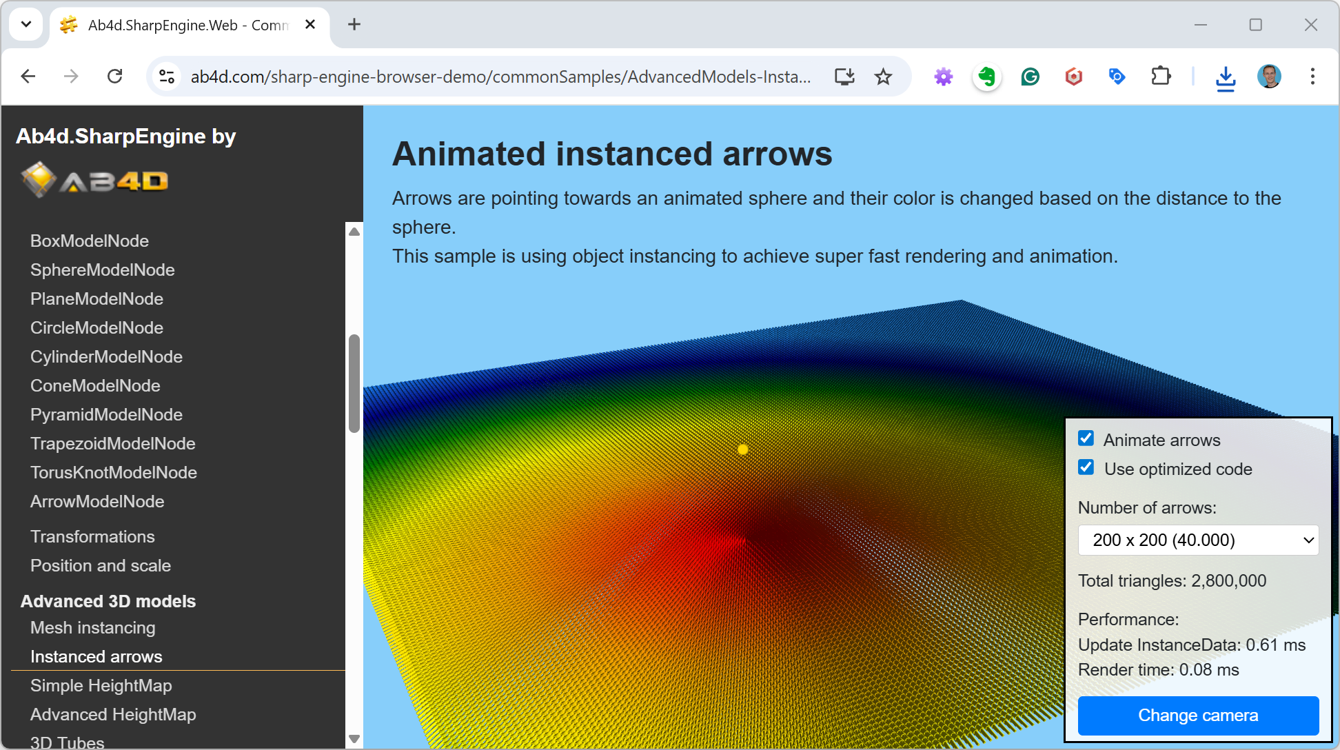 - It takes only 0.68 ms to calculate the directions for 40.000 arrows (for each arrow, a 4x4 transformation matrix is calculated that points the arrow towards the animated yellow sphere; this time also includes the time to upload the matrices to the GPU)